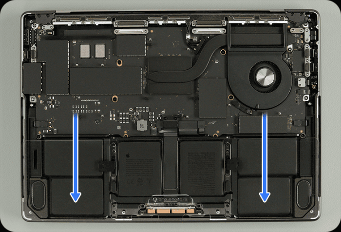Раньше замены батареи на MacBook Pro M5 требовалось демонтировать несколько модулей, прежде чем появлялся доступ к аккумулятору. Теперь требуется лишь снять нижнюю крышку и отключить кабеля блока управления батареей.
