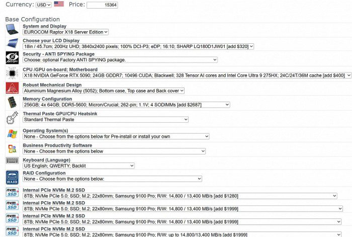 С нынешними ценами на память ноутбук с 64 ГБ ОЗУ — это роскошь, но Eurocom представила тяжелый люкс в виде новейшего Raptor X18: в топовой конфигурации у него 256 ГБ памяти. Такой большой объем — опция за почти 2700 долларов. SSD на 32 ТБ — тоже опция за почти 7500 долларов. Если «упаковать» новинку по максимуму, то цена составит 15 364 доллара. Примерно столько сейчас стоит 100-граммовый слиток золота.