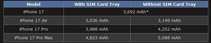 Данные, полученные из нормативных документов, приведены в таблице. Из них следует, что iPhone 17 Pro Max может стать первым смартфоном Apple, оснащённым аккумулятором ёмкостью более 5000 мА·ч. Батарея на 5088 мА·ч почти на 8 % больше, чем у прошлогоднего iPhone 16 Pro Max. Опубликованные данные указывают на то, что сверхтонкий iPhone 17 Air оснастят аккумулятором ёмкостью чуть более 3000 мА·ч. Ранее ходили слухи, что из-за тонкого корпуса этот смартфон получит батарею ёмкостью менее 3000 мА·ч.