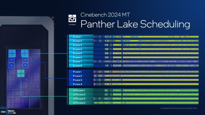 За управление питанием и распределение потоков в Panther Lake отвечает обновлённый планировщик Thread Director, который адаптируется к меняющимся рабочим нагрузкам. При высокой нагрузке на графический процессор прочие задачи назначаются на E-ядра, чтобы освободить ресурсы для обработки графики. По заявлению Intel, этот метод позволяет повысить частоту кадров примерно на 10 % в игровых нагрузках. Новая системная утилита Intelligent Experience Optimizer может автоматически переключаться между режимами питания Windows в зависимости от потребностей, обеспечивая прирост производительности до 20 % при тех же ограничениях энергопотребления.