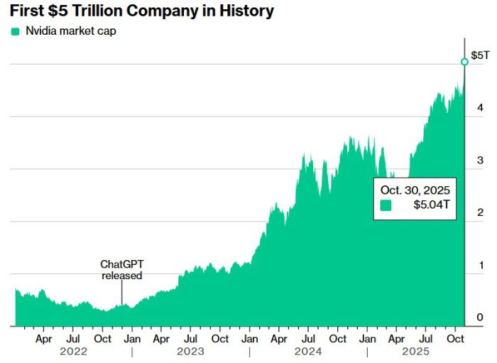 На сегодняшних торгах компания Nvidia достигла исторического уровня рыночной капитализации в $5 трлн. Акции выросли на 5,2 % до $211,47 по состоянию на 9:36 утра по нью-йоркскому времени (16:36 по Москве), что позволило Nvidia преодолеть этот рубеж. Прошло всего четыре месяца с тех пор, как рыночная оценка компании превысила $4 трлн. Рыночная оценка Nvidia резко выросла после объявления о сделках с Nokia, Samsung, Hyundai Motor и другими компаниями.