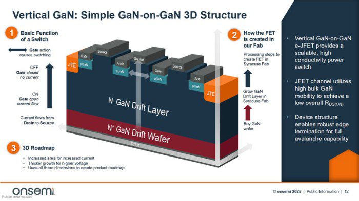 Передача тока в горизонтальной плоскости параллельно подложке больше не в тренде, vGaN меняют ориентацию прохождения тока с горизонтальной на вертикальную. Секрет — в самой подложке. Подавляющее большинство силовых элементов GaN создаются на кремниевой или сапфировой подложке. В компании onsemi (до ребрендинга 2021 года — ON Semiconductor) начали производить элементы на подложках из нитрида галлия, что открыло возможность организовать для течения тока путь с самого низа до самого верха — от стока в подложке до истока с управляющим затвором в верхней части элемента.