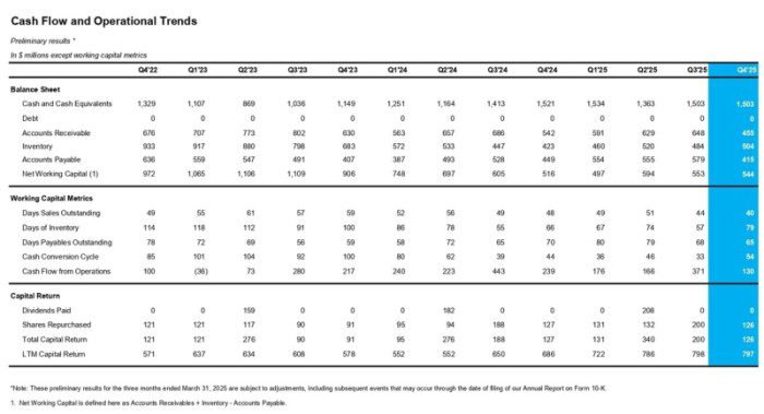 EPS по GAAP составила $0,96, снизившись на 10 % по сравнению с четвертым кварталом предыдущего года. EPS по Non-GAAP составила $0,93, снизившись на 6 % по сравнению с предыдущим годом. Денежный поток от операций составил $130 млн.
