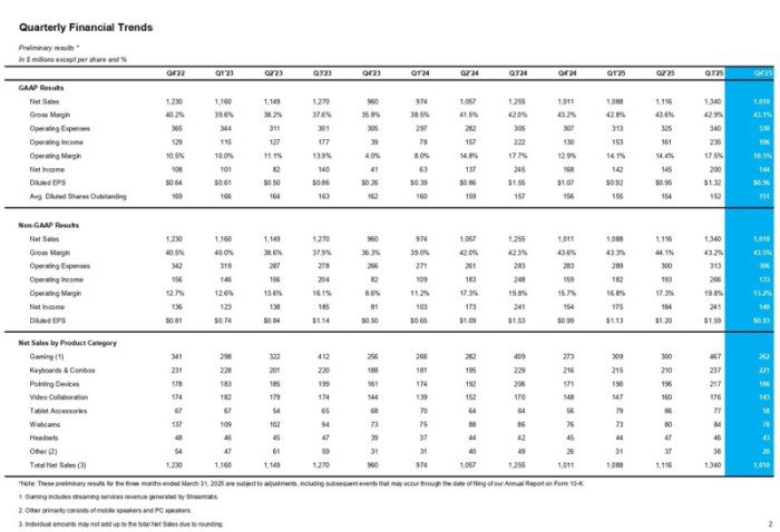 «Наши команды снова продемонстрировали впечатляющие результаты в этом четвёртом квартале, завершив год строгой операционной дисциплины, — поддержал её финансовый директор Logitech Маттео Анверса (Matteo Anversa). — Мы завершили 2025 финансовый год с устойчивым ростом во всех регионах, клиентских каналах и почти во всех наших категориях. Наш рост по-прежнему был чрезвычайно прибыльным, с валовой прибылью не по GAAP в 43,5%. Мы были рады вернуть акционерам 797 миллионов долларов наличными в этом году».