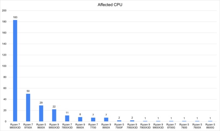 Пользователи Reddit в декабре собрали статистику выхода из строя различных моделей процессоров на материнских платах ASRock. На тот момент было известно о 183 подтверждённых случаях выхода из строя процессоров Ryzen 7 9800X3D, 50 случаях с процессорами Ryzen 7 9700X и 29 — с чипами Ryzen 5 9600X, а также о 22 случаях с моделями Ryzen 9 9950X3D. В эту статистику не были включены последние инциденты, произошедшие в январе.