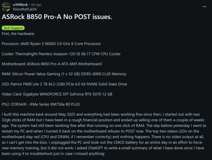 В различных ветках обсуждений пользователи описывают системы, которые сначала работали, а затем внезапно переставали загружаться. В нескольких сообщениях упоминаются постоянно горящие светодиоды отладки DRAM или CPU на материнских платах. Переустановка модулей оперативной памяти, сброс CMOS, замена компонентов и тестирование с различными настройками не помогают.
