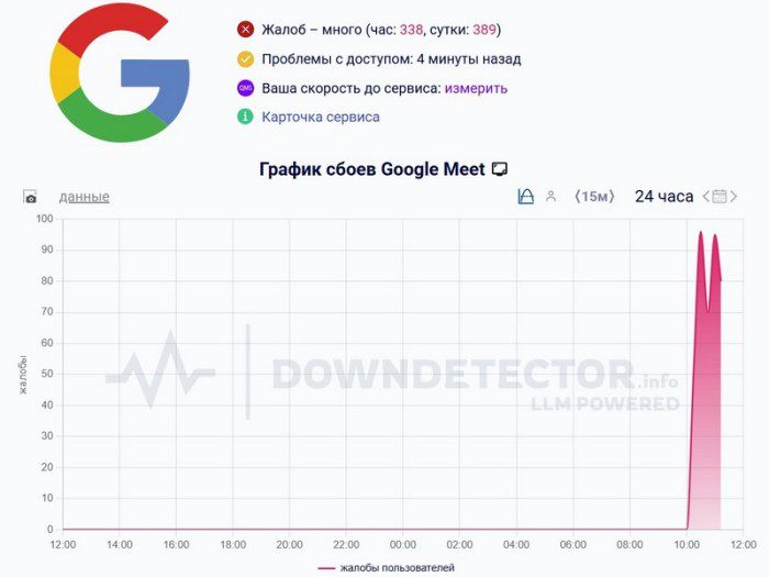 Россияне пожаловались на проблемы в работе сервиса видеосвязи Google Meet. По данным портала Downdetector, количество жалоб на сбои в работе за последний час резко увеличилось и перевалило за три сотни на момент публикации данного материала.