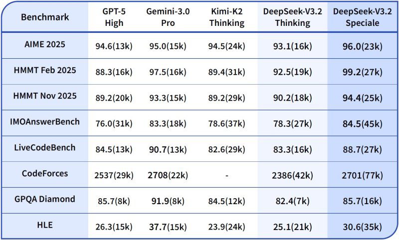 DeepSeek утверждает, что модели серии V3.2 — это её первые нейросети, созданные для ИИ-агентов. Компания заявляет, что DeepSeek V3.2 обеспечивает производительность уровня GPT 5 при выполнении общих задач. Китайский стартап также утверждает, что DeepSeek-V3.2-Speciale обладает способностями к рассуждению, сопоставимыми с новейшей моделью Gemini 3 Pro от Google, особенно в сложных сценариях решения проблем.