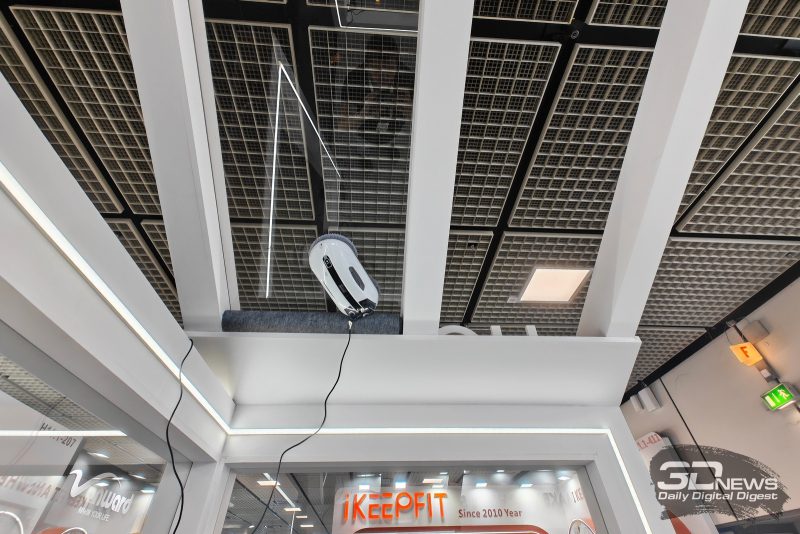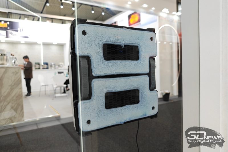 Вторая модель, которая была представлена на стенде компанией Hobot, — R3 Ultrasonic. Это компактный и функциональный круглый робот-мойщик окон, который передвигается с помощью вращающихся салфеток. По заявлению производителя, вращающий момент салфеток, надетых на диски, имитирует движение руки человека, за счёт чего наиболее эффективно оттирает даже самые стойкие загрязнения.