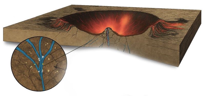 Исследователи использовали мощный современный метод изотопного биосигнатурного анализа и радиоизотопного датирования, чтобы отследить восстановление сульфатов микроорганизмами в минералах и трещинах гидротермальной системы под кратером.