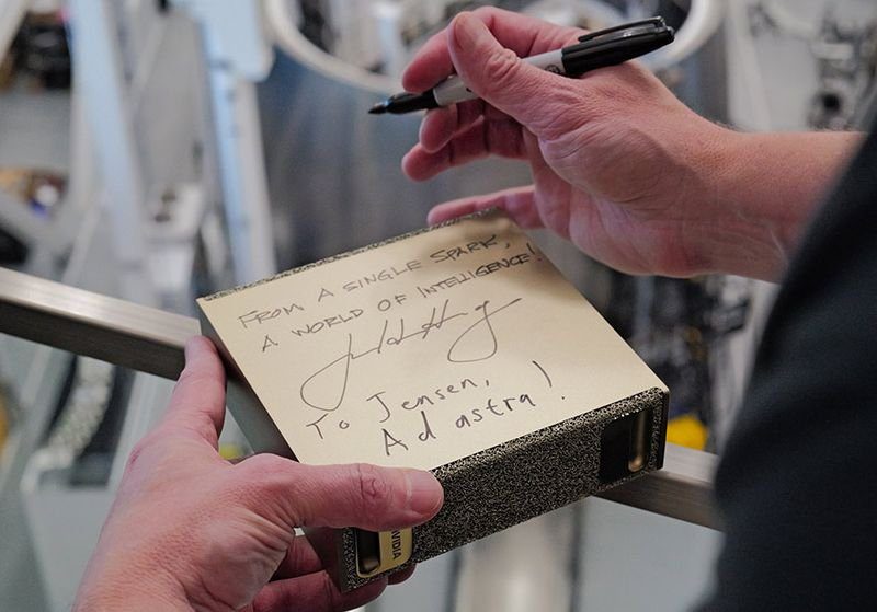 Девять лет назад Дженсен Хуанг как раз передал Илону Маску экземпляр системы DGX-1 в стенах OpenAI, поскольку на тот момент миллиардер принимал участие в его деятельности и ещё не успел поссориться с прочими соратниками по стартапу. Чтобы вручить DGX Spark Илону Маску, главе Nvidia пришлось посетить Техас, где у аэрокосмической компании SpaceX есть стартовая площадка. Хуанг даже отшутился про «доставку самого маленького суперкомпьютера по соседству с самой большой ракетой». На экземпляре DGX Spark для Маска рукой Хуанга была сделана надпись «Из одной искры — мир интеллекта», а Маск ниже автографа главы Nvidia добавил «К Дженсену, к звёздам», использовав известное выражение на латыни.