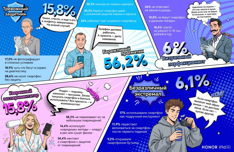 Самые редкие группы — безразличные экстремалы (6,1 %), считающие, что смартфон обязан выдерживать любые приключения, и визуальные перфекционисты (6 %), для которых малейшая царапина превращается в катастрофу.