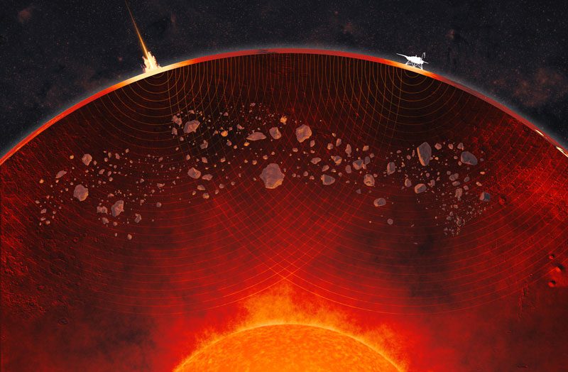 Станция InSight, разместившая первый сверхчувствительный сейсмометр на Марсе, с 2018 года и до завершения работы в 2022 году зафиксировала 1319 марсотрясений, что позволило учёным изучить состав коры, мантии и ядра планеты. Высокочастотные сейсмические волны, вызванные метеоритными ударами (а землетрясений от движения тектонических плит, как на Земле, на Марсе нет), показали замедление при прохождении через локализованные области мантии, которые тем самым демонстрировали отличный от окружающей среды состав. Компьютерное моделирование подтвердило, что эти области содержат инородный материал, внедрённый в мантию в результате древних столкновений.