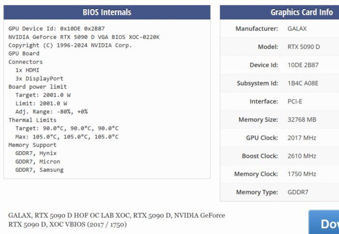 Мы уже говорили о видеокарте Galax RTX 5090D HOF, которая создавалась для оверклокеров, но всё же попала в розницу. Эта карта выделяется двумя 16-контактными разъёмами питания, которые позволяют подать на неё 1200 Вт. Оказалось, что BIOS карты рассчитан ещё большую мощность.