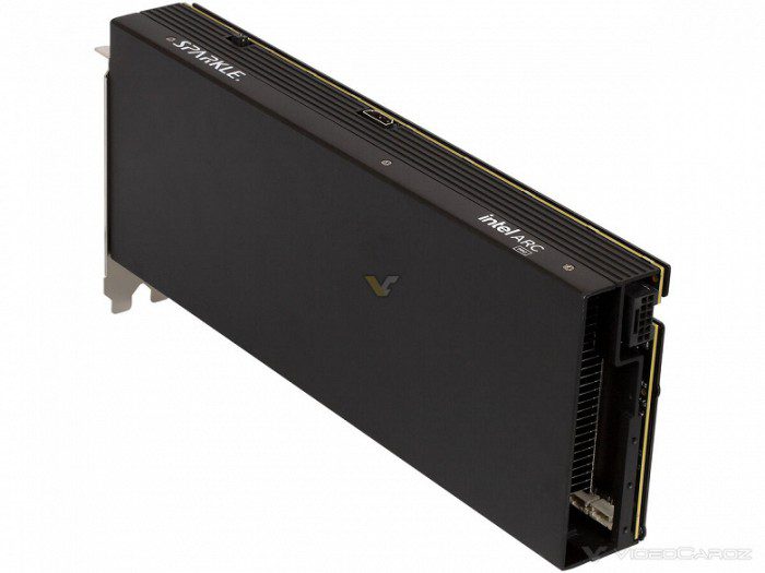 Возвращаясь к HDMI, неясно, зачем он нужен внутри. При этом тут ещё и 16-контактный разъём питания, что нетипично для видеокарт Intel, и он размещён на внутренней грани.
