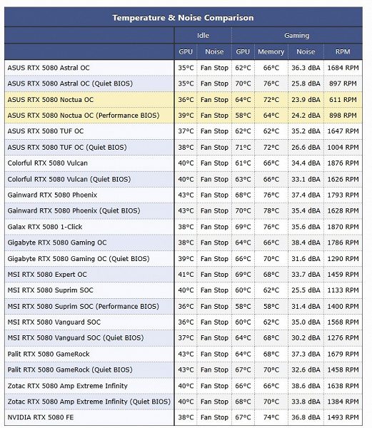 Asus ROG Astral в режиме Quiet может приблизиться к этому показателю со своими 25,8 дБА и 897 об/мин, но при этом температура GPU в этом случае достигает 70 градусов, а у Noctua — 58 либо 64 градуса в зависимости от режима. То есть это однозначно самая тихая карта, и также самая тихая в пересчёте на температуру GPU. Только модель MSI Suprim в режиме Performance может обеспечить те же 58 градусов, только при уровне шума в 31,4 дБА.