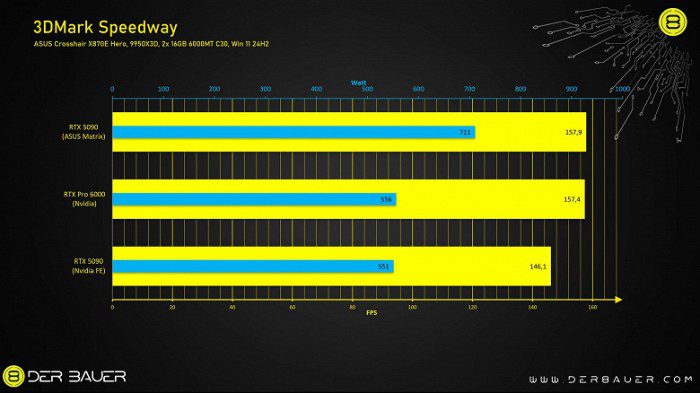 Но за рекордные показатели приходится платить. Потребляет новинка Asus заметно больше. В том же 3DMark речь идёт о 711 Вт против 556 Вт у RTX Pro 6000 и 551 Вт у модели FE. В играх показатель может сильно отличаться от проекта к проекту, но потребление всё равно всегда выше всех.