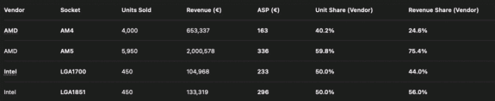 Лучший из процессоров Intel в декабре на Amazon Germany — Core Ultra 7 265K, но количество проданных CPU невелико, всего 300. Для сравнения, Ryzen 7 5800X за месяц разошелся в количестве 2000 штук. Всего же за месяц было продано почти 10 000 процессоров AMD против 900 процессоров Intel.