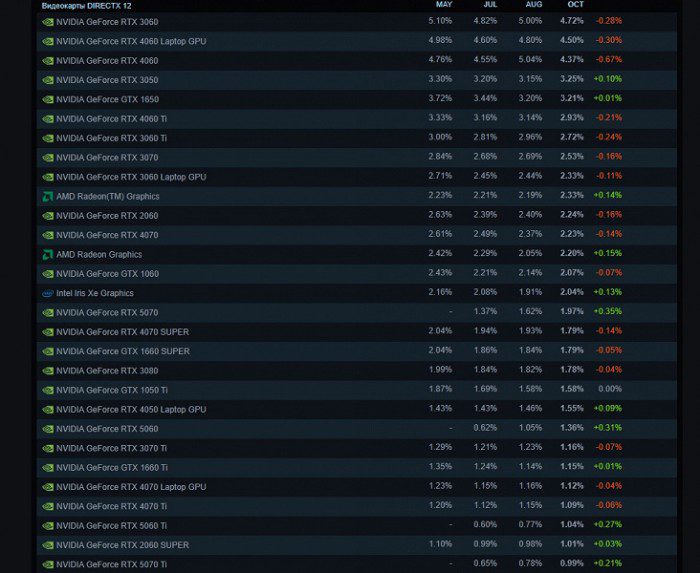 Компания Valve раскрыла статистику Steam за октябрь. Как обычно, нас интересуют в первую очередь видеокарты, и тут у нас снова смена лидера.
