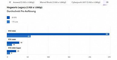 В таких условиях, учитывая, что RTX 30 и RTX 20 не поддерживают никакой генерации кадров, в отличие от той же RTX 4060, разница между адаптерами, конечно, гигантская. RTX 5060 опережает RTX 3060 в четыре-шесть раз, а показатель 1% Low может быть выше в семь-восемь раз. При этом влияние ограниченного объёма памяти можно видеть даже в таких условиях. В Hogwarts Legacy при производительности в 267 к/с показатель 1% Low всего лишь 62 к/с, то есть более чем вчетверо ниже.