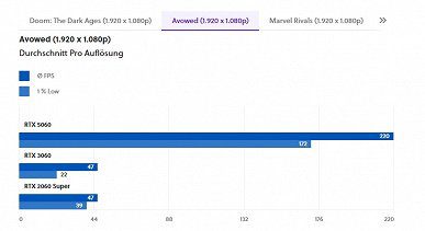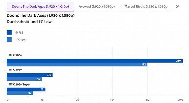 - Настройки: Разрешение (1080p) и настройки графики фиксированы. Решающим фактором здесь является то, что, хотя RTX 5060 может использовать четырехкратную генерацию нескольких кадров, старые графические процессоры не обладают возможностью генерации дополнительных изображений с использованием ИИ.