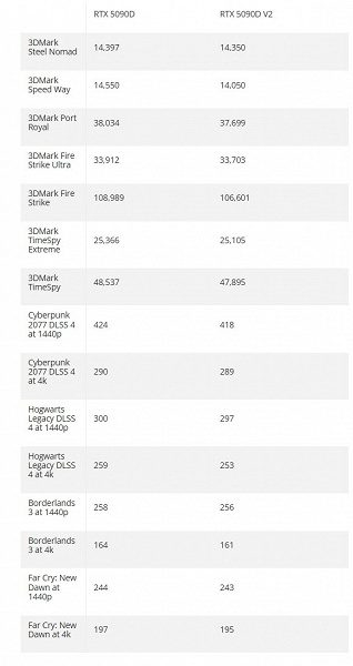 Китайские авторы раздобыли карту и сравнили её с обычной RTX 5090D. Оказалось, что разница минимальна. В большинстве случаев новинка отстаёт от первой версии всего на 2-3%, чем можно смело пренебречь.