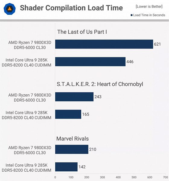 Также авторы сравнили скорость компиляции шейдеров, которая становится для геймеров всё привычнее. И вот тут Core Ultra 9 заметно быстрее, опережая конкурента примерно на 30%. Но это легко объясняется тем, что процессорная часть в обычных вычислениях у флагмана Intel, конечно, намного быстрее.