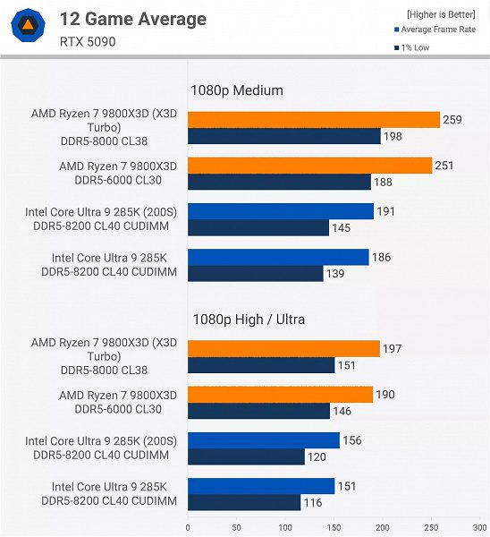 Как обычно, все тесты проводились в Full HD и с GeForce RTX 5090. Вряд ли найдётся много геймеров, использующих такое сочетание, но для оценки игровой производительности CPU это оптимальный вариант.