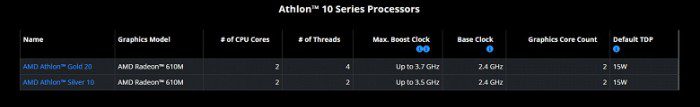Теперь у нас две модели Athlon: Athlon Gold 20 и Athlon Silver 10. Первый полностью копирует Gold 7220U. У него два ядра с поддержкой SMT и iGPU Radeon 610M. А у Athlon Silver 10 всё то же самое, только без поддержки SMT и с чуть меньшей частотой. То есть тут не только два ядра, но и потока всего лишь два, что может быть проблемой в современном ПО.