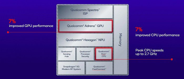 Snapdragon 7s Gen 4, как и предшественница, выпускается по 4-нанометровому техпроцессу, конфигурация процессора тоже не изменилась, она трехкластерная — 1+3+4. Единственное различие в процессорах новой и старой SoC — повышенная на 200 МГц (до 2,7 ГГц) частота большого ядра Arm Cortex-A720. Три ядра Cortex-A720 и четыре ядра Cortex-A520 работают на частотах 2,4 ГГц и 1,8 ГГц соответственно — как у Snapdragon 7s Gen 3. Графический процессор Adreno прибавил в производительности те же 7%, что, вероятно, вряд ли будет заметно в играх.