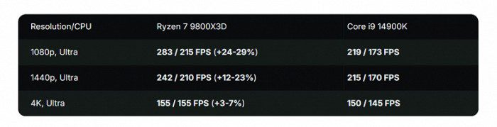 При разрешении Full HD Ryzen 9800X3D показал на 29% большую производительность, чем Core i9-14900K, потребляя при этом на 40% меньше. Использование GPU (в тестировании участвовала GeForce RTX 5090) в случае CPU AMD достигло 80–90%, тогда как в случае процессора Intel — лишь 70%. В других сценах разница составила около 25% — в пользу CPU AMD.
