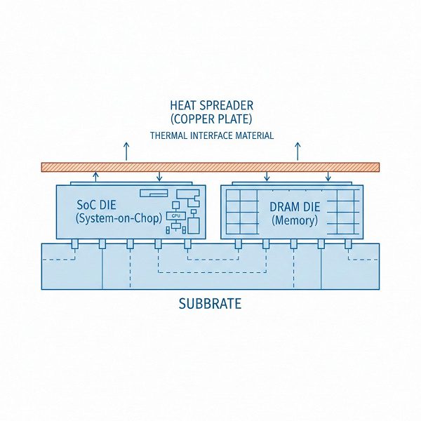 Суть в том, чтобы размещать кристалл SoC и чип DRAM не один на другой, как это обычно делают сейчас, а рядом друг с другом. Сверху всё это будет прикрываться тончайшей медной пластиной Heat Pass Block (HPB).