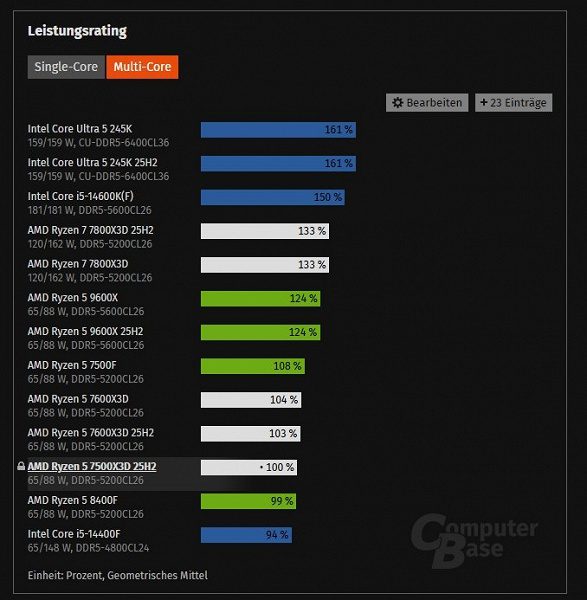 В итоге, как видим, Ryzen 5 7500X3D выступает примерно на уровне Ryzen 5 8400F и на 5% обходит немолодой Core i5-14400F. Более свежий и более доступный Ryzen 5 9600X быстрее уже на 24%, а тот самый Core Ultra 5 245K опережает новинку на 60%.