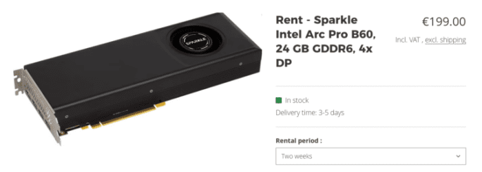 Видеокарта Intel Arc Pro B60 с 24 ГБ является очень доступным предложением, если говорить именно об объёме памяти. К примеру, необычная пассивная версия в Австралии без учёта налогов стоит 530 долларов. В Европе карта намного дороже, и на рынке появилось необычное предложение — аренда.
