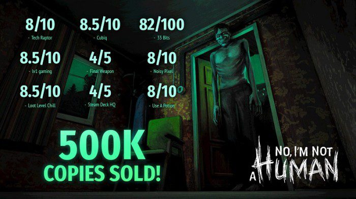 Как стало известно, к настоящему моменту No, I’m not a Human разошлась в количестве уже 500 тыс. экземпляров. Разработчики «от всей души» поблагодарили игроков: «Этот момент навсегда останется в наших сердцах».